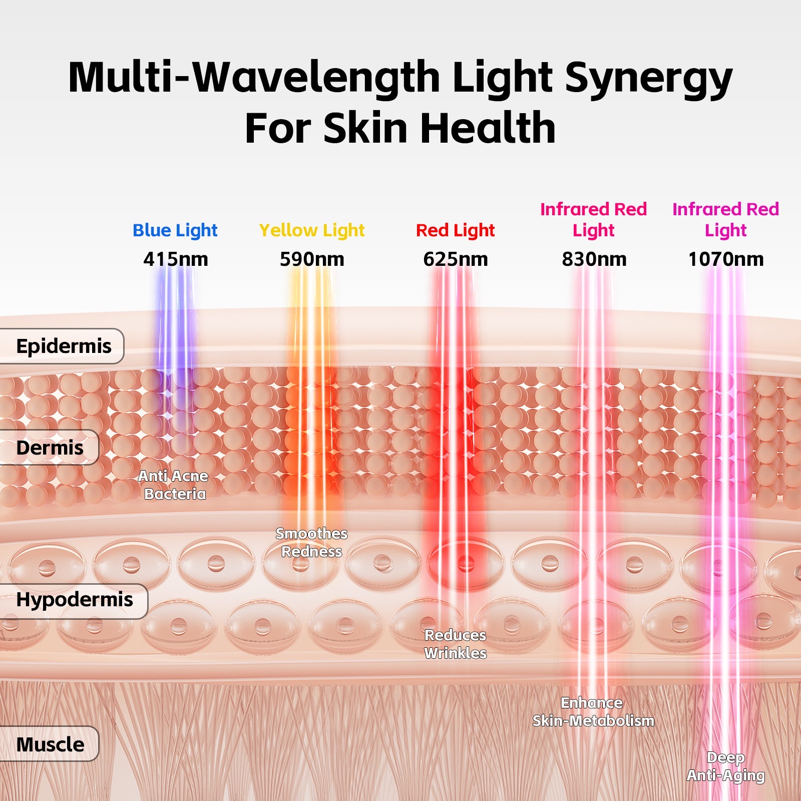 Near-Infrared Light(850 nm): Penetrates deep into the skin, stimulates collagen production, improves skin texture, and enhances overall skin rejuvenation.
